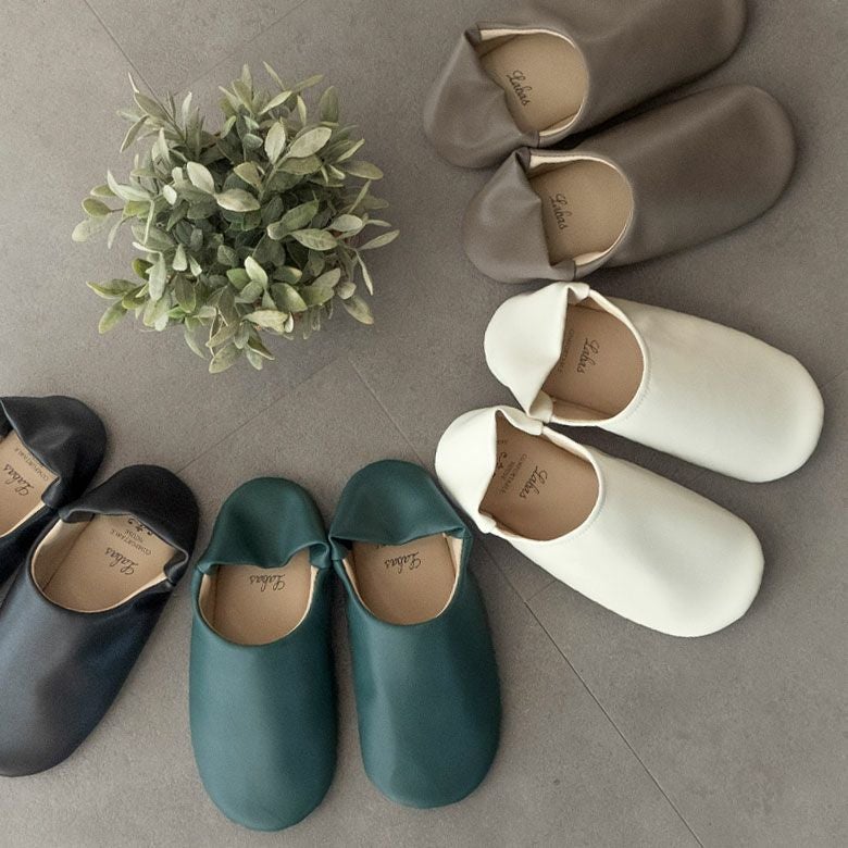 室内履き バブーシュスリッパ 合皮 ギフト 来客用 かわいい バブーシュ 無地 レディース ソフトレザー ホワイト グレー ブルー ブラック [90289]【 スリッパ ルームシューズ レザー調 合成皮革 2way おしゃれ シンプル グレイッシュカラー モノトーン プレゼント 新築祝 玄関 リビング 寝室 トイレ 入園式 入学式 授業参観】