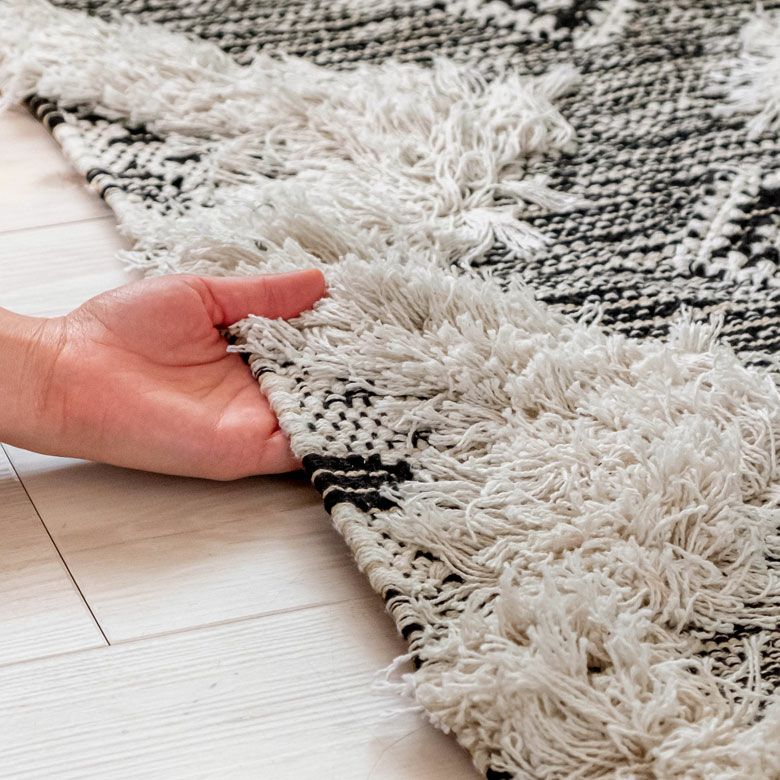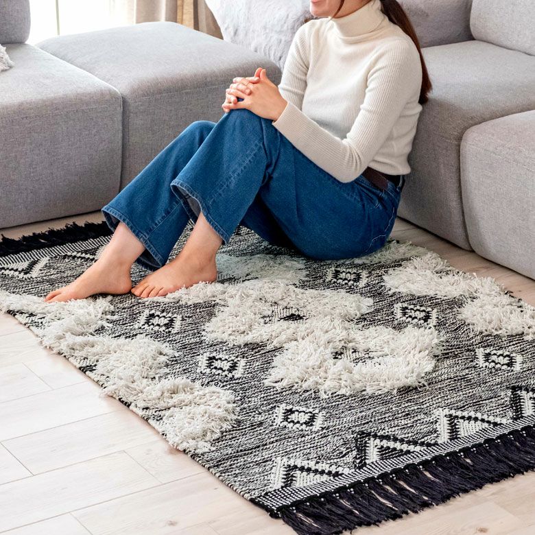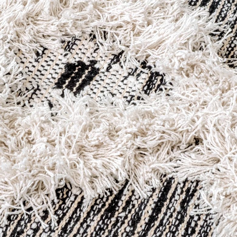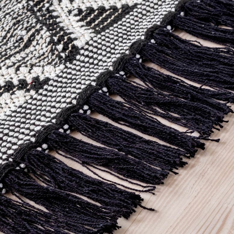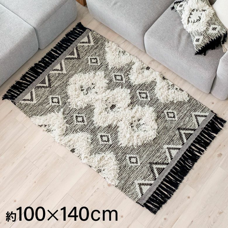 キリムラグ 民族柄 民族調 サーフィン コットン 綿 100×140 ラグ ラグマット オルテガ柄 エスニック フリンジ デザイン 100×140cm 白黒 BOHO [34419]【 カーペット 絨毯 じゅうたん おしゃれ お洒落 エスニック ボーホー モノトーン 長方形 オールシーズン 春 夏 秋 冬 厚手 敷物 マット アジアン アジアン雑貨 】