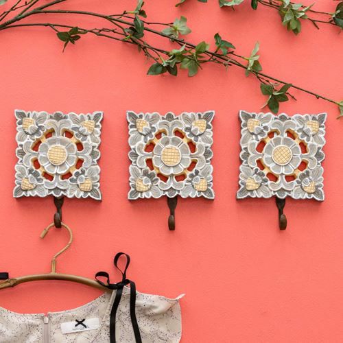 壁掛けフック 木彫り風 引掛け収納 壁掛け収納 吊るす おしゃれ フック 壁掛け 木彫り風 グレイッシュロータス 約15cm×20cm[13551]【 ウォールフック 壁掛けフック シングル コート掛け 帽子掛け ストール ショール マフラー シンプル ナチュラル 引っ掛け カバン掛け コートフック 帽子かけ 玄関 収納 アジアン雑貨 バリ島 】