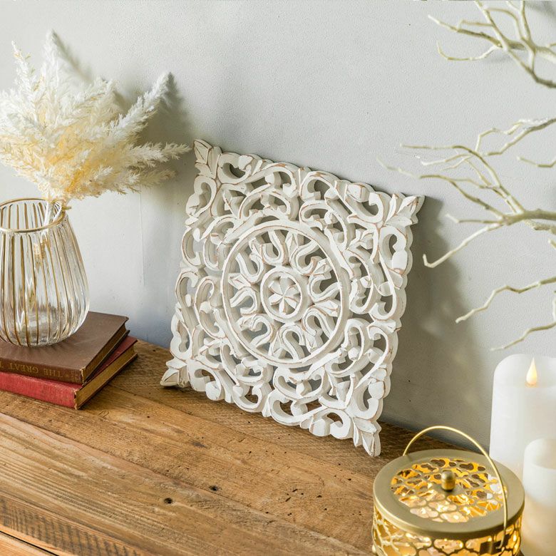 南国 リゾートインテリア パネル オブジェ 立て掛け 木彫り レリーフ 壁掛け アラベスク 白 ホワイト インド製 正方形 約 W 30 × D 30 × H 1.5 cm ウッドカービング アートパネル 木彫刻 壁飾り アジアンレリーフ ウォールデコレーション おしゃれ バリ島 バリ雑貨 北欧 アジアン 雑貨 アジアン雑貨 韓国インテリア [34558]