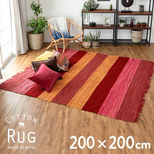 キリムラグ ラグマット インド綿 赤 エスニックラグ ネイティブ コットン ラグ カーペット ラグマット ワイドボーダー柄 フリンジ付き 綿100% 200×200cm ピンク [34406-pk]【 コットンキリム マットセンターラグ キリム風ラグ ストライプ柄 正方形 リビング らぐ おしゃれ 夏用 オールシーズン アジアン 雑貨 アジアン雑貨 】
