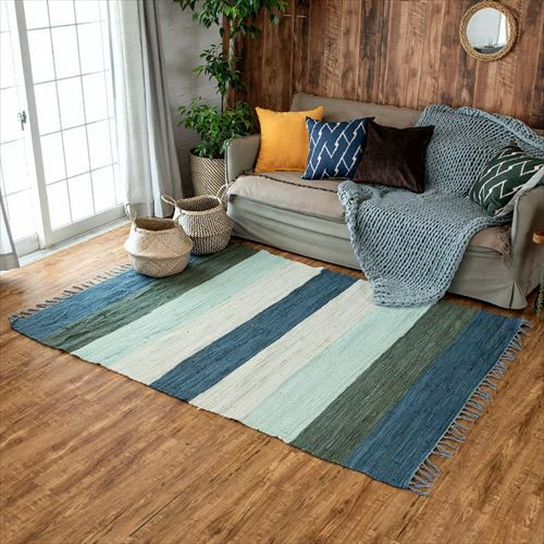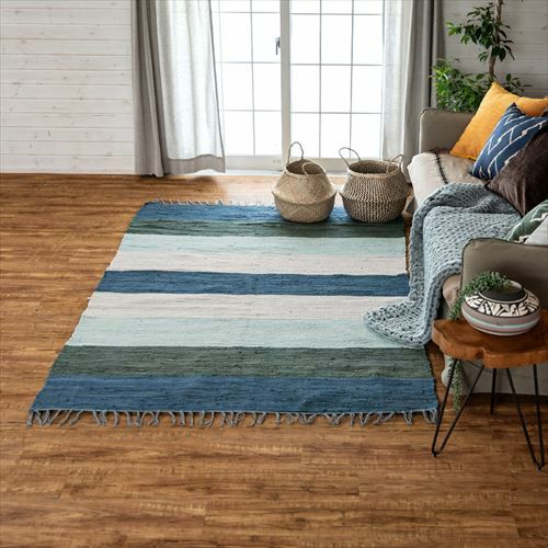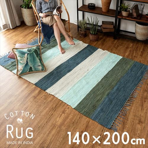 キリムラグ ラグマット インド綿 青 エスニックラグ ネイティブ コットン ラグ カーペット ラグマット ワイドボーダー柄 フリンジ付き 綿100% 140×200cm ブルー [34405-bl]【 コットンキリム マット キリム風ラグ ストライプ柄 リビング かーぺっと らぐ おしゃれ 夏用 オールシーズン インテリア アジアン 雑貨 アジアン雑貨 】
