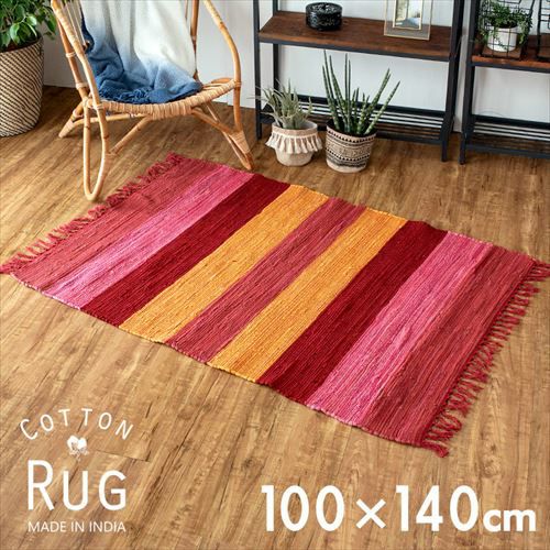 キリムラグ ラグマット インド綿 赤 エスニックラグ ネイティブ コットン ラグ カーペット ラグマット ワイドボーダー柄 フリンジ付き 綿100% 100×140cm ピンク [34404-pk]【 コットンキリム マット キリム風ラグ ストライプ柄 リビング かーぺっと らぐ おしゃれ 夏用 オールシーズン 綿 インテリア アジアン 雑貨 アジアン雑貨 】