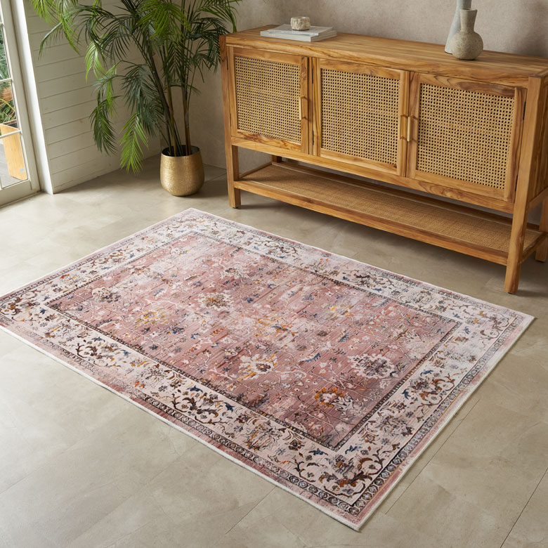 ヴィンテージラグの風合いを“手軽に・清潔に”楽しめる ペルシャ絨毯風ウォッシャブルラグマット!リビングをおしゃれに彩るオリエンタル柄 床暖房対応で年中快適 滑り止め付き 長年使いこんだようなかすれを再現したアンティーク風デザインのおしゃれなラグカーペット/約130x190cm 洗濯機で丸洗いOK 薄手で簡単お掃除&一年中使える 軽くて畳めてラクラク収納ラグマット [84400-d]