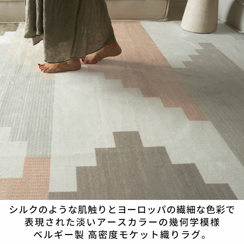 ヨーロッパらしい洗練されたデザインと美しい発色が魅力のRAGOLLEモケット織りラグ シルクのような肌触りとヨーロッパの繊細な色彩で表現された淡いアースカラーの幾何学模様 ベルギー製 高密度モケット織り ラグマット 約 135×195cm ジオメトリック柄 ラグ カーペット おしゃれ 絨毯 ビスコース アジア工房 [84391]