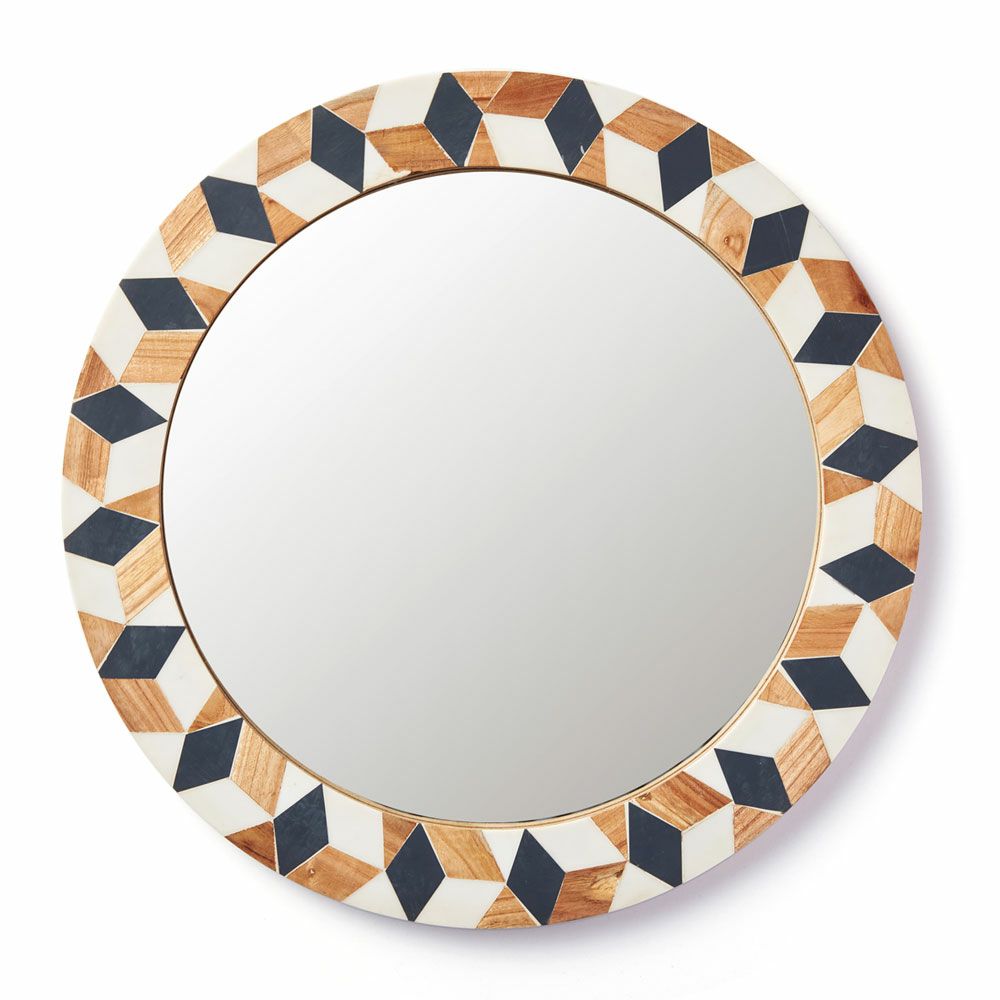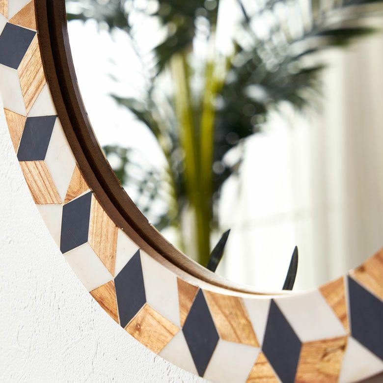 ラウンド インテリアミラー 壁にかける 丸い鏡 玄関鏡 新生活 鏡 壁掛け鏡 円形 丸型 ウッド×レジン ジオメトリック柄 約 W 45 × D 45 × H 2 cm 鏡直径 約35cm かがみ ウォールミラー 化粧鏡 壁かけ鏡 立て掛け鏡 ウォールデコレーション リビング 寝室 玄関 トイレ おしゃれ 北欧 モロッカン アジアン雑貨 モロッコ BOHO [34552]