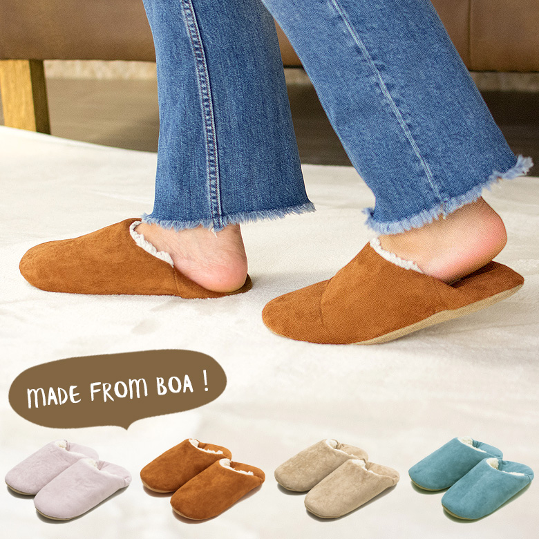 シンプルながらもころんとした丸みがかわいらしい、素足でもあったかいルームシューズ。