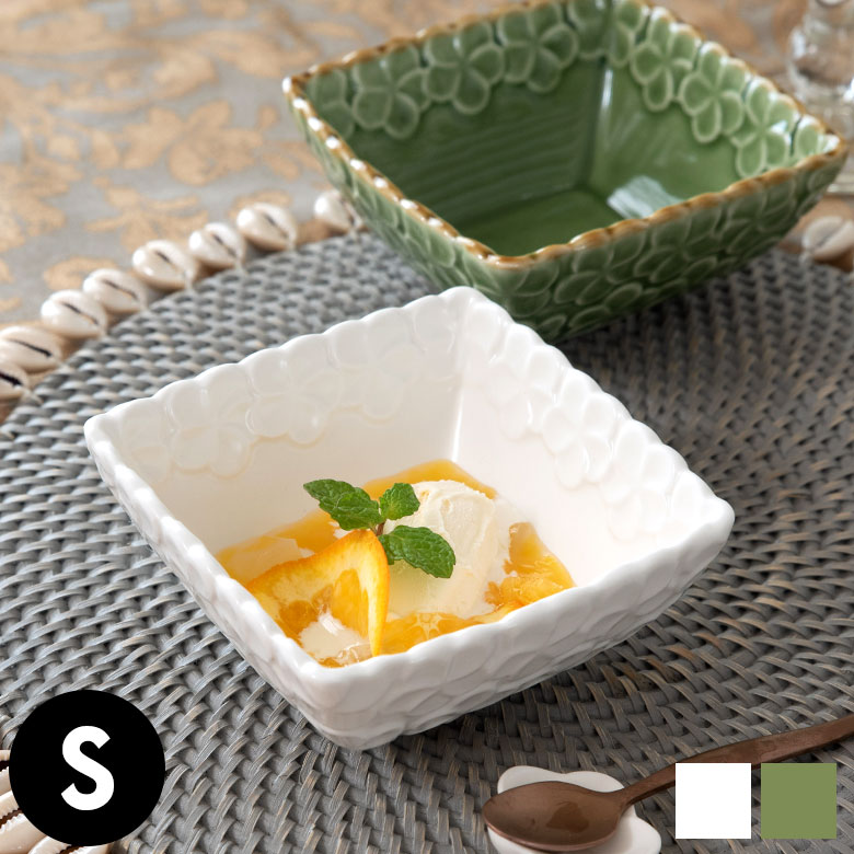 プルメリアの花をあしらった、南国リゾート感たっぷりのスクエアボウル。数人分のサラダや ご飯ものを盛ったり、パーティーシーンにも役立ちます。