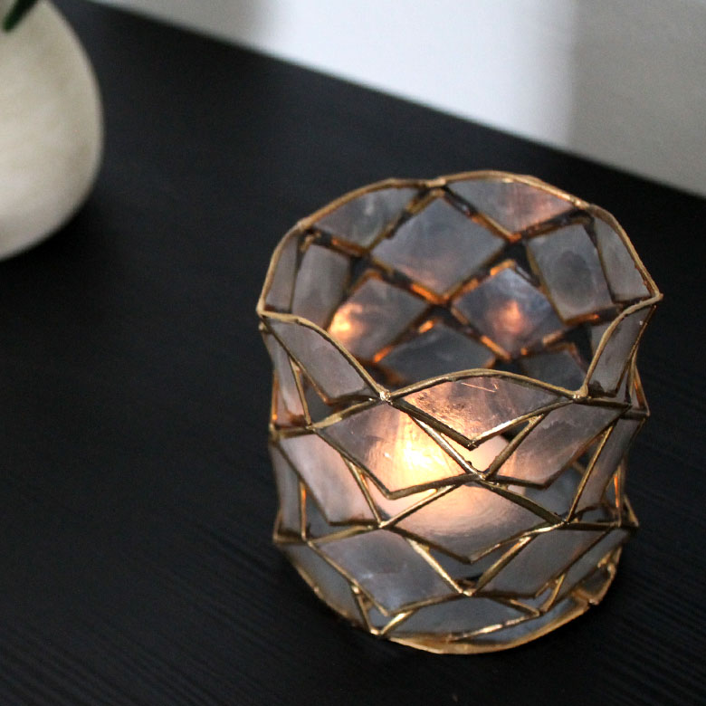 光が透けるほど薄く削った透明感のあるカピスシェルのキャンドルホルダー。