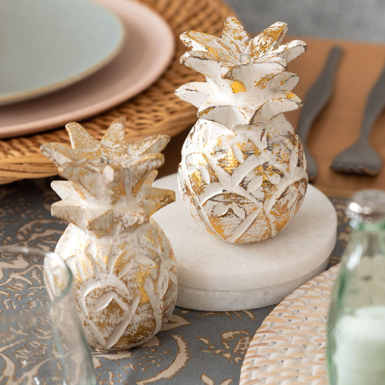 ランダムに輝くゴールドがアンティークのような風合い。コロンとした形が可愛らしい、手のひらサイズのパイナップルオブジェ。
