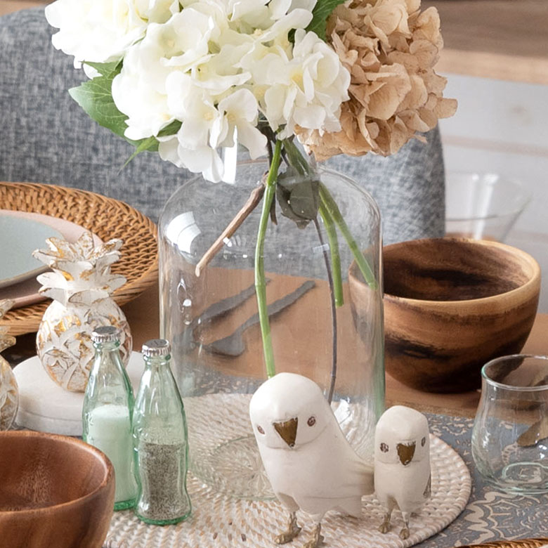 幸運の鳥フクロウやパイナップルのオブジェも、テーブルを盛り上げてくれます。