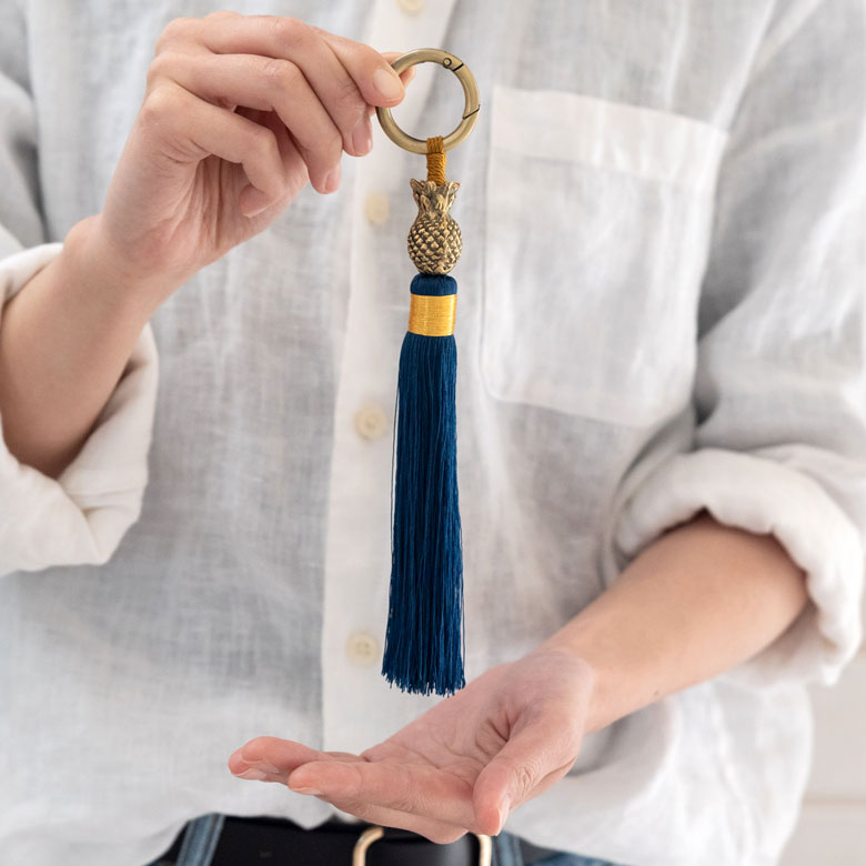真鍮製のパイナップルとカラフルなタッセルを組み合わせた、 南国リゾートの雰囲気漂うアイテム。