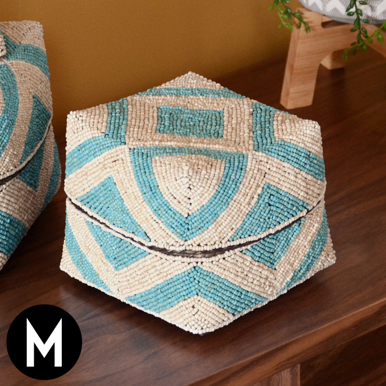 手作業で竹のスライスを編み、贅沢に底以外の全面をビーズでデコレーション。バリ伝統の竹製バスケット「ソカシ」。