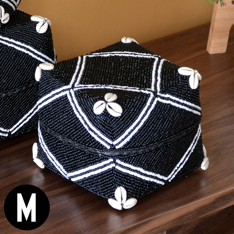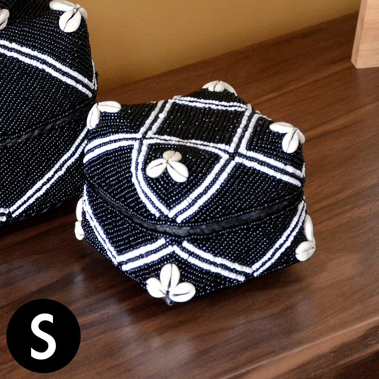 手作業で竹のスライスを編み、贅沢に底以外の全面をビーズで デコレーションした、華やかなアイテムです。