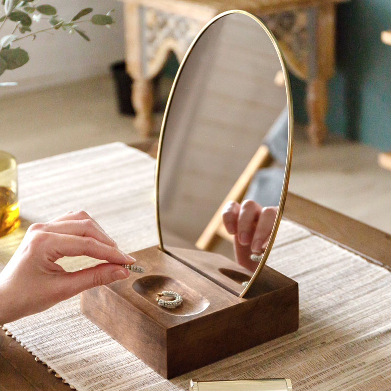 天然木のスタンドに、真鍮フレームのミラーを差し込んで使う、 アンティークな雰囲気漂う卓上ミラー。