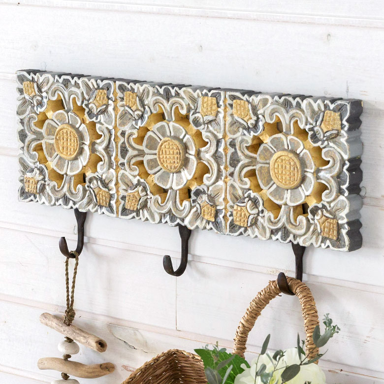 一つ一つ丁寧に彫られた、バリ風インテリアに欠かせない 「ウッドレリーフ」の3連壁掛けフック。