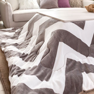シェブロン柄のこたつ布団と、ホワイトのテーブルは洗練感をただよわせ、