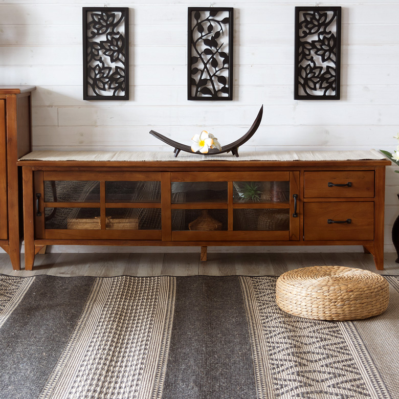 スライド式のガラス扉と引き出しがついた、ワイドタイプのローボード。