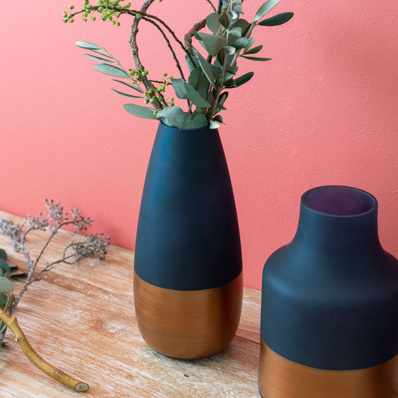 マットなカラーガラスにコッパー(銅)カラーのボトムがアクセントとなり、 シンプルに一輪花やグリーンを入れるだけで絵になるフラワーベース。