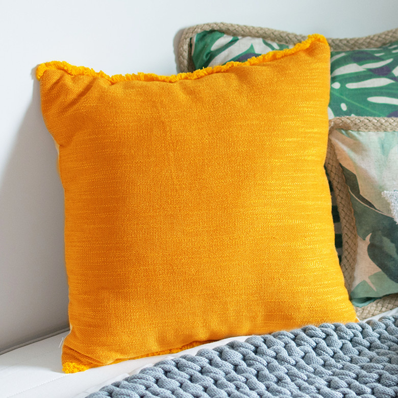 インテリアのアクセントになる、ビタミンカラーのクッションカバー。