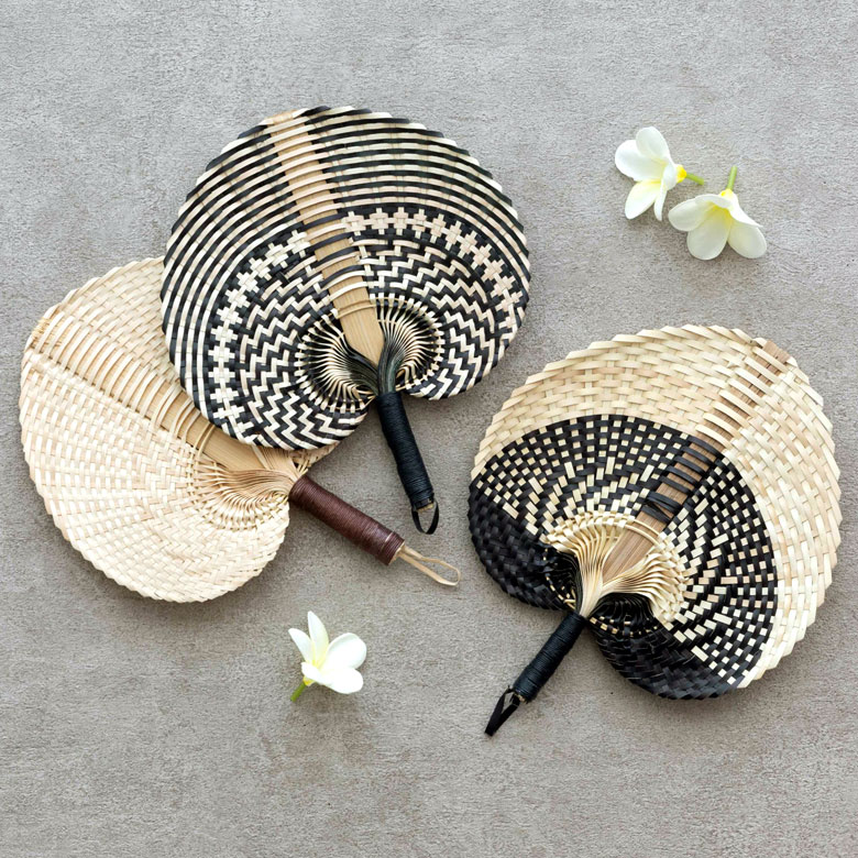 バリ島の乾燥地帯に分布する「ロンタル椰子」を使い編みあげた、モダンアジアンなうちわ。