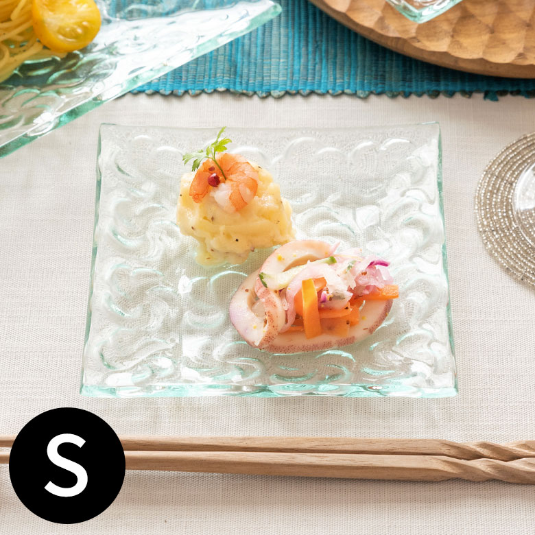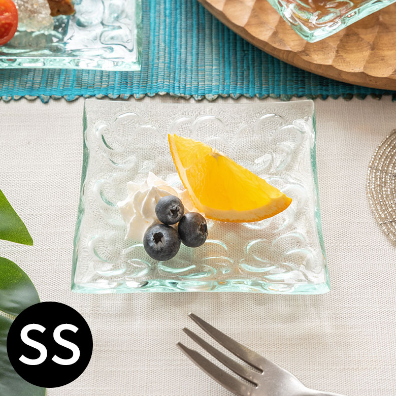 4サイズ展開のプルメリア柄プレート。SSサイズは、デザートやカットフルーツなどを乗せるのにぴったりな10cm角。