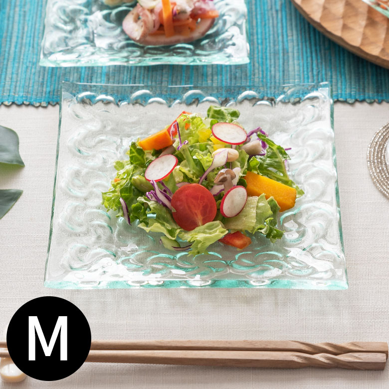 4サイズ展開のプルメリア柄プレート。Mサイズは、サラダやオードブルなど色々なシーンで使いやすい16.5cm角。