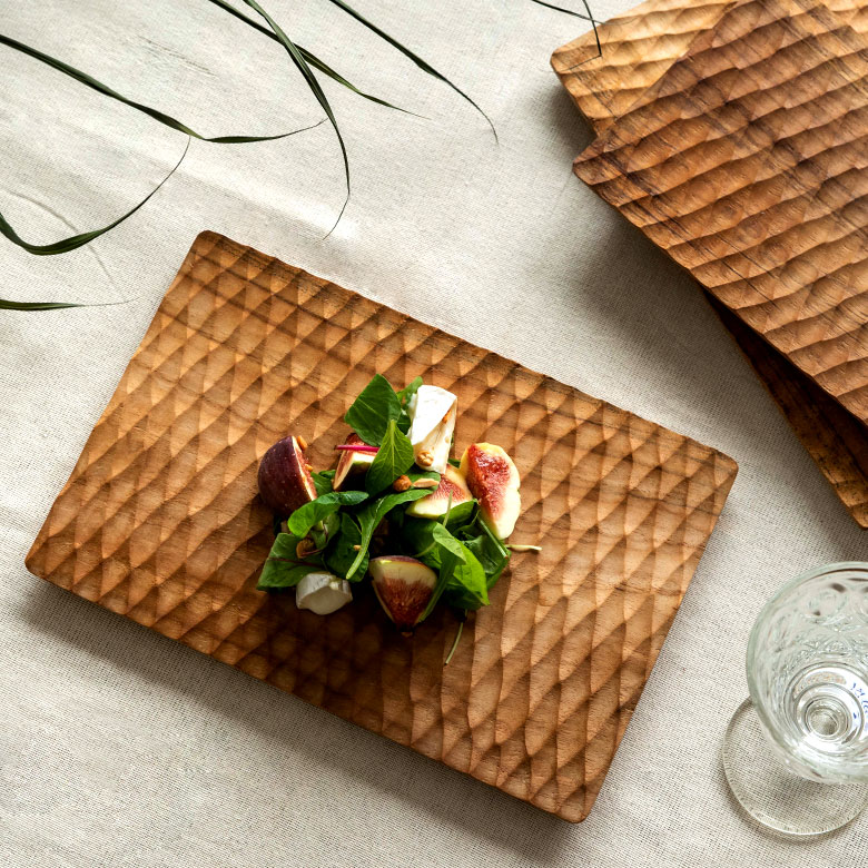 チーク無垢材の1枚板を丁寧に彫った贅沢なプレート。