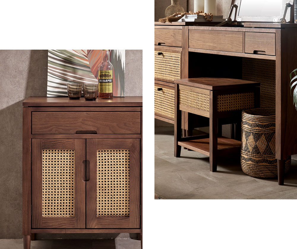 天然ラタン×天然木ウォールナットを組み合わせた「Tilem elegan(ティレム エレガン)」シリーズのアジアンモダンなキャビネット。