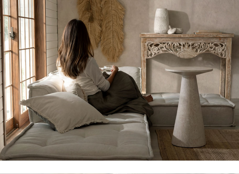 朝の光と天然素材のリトリートリビング