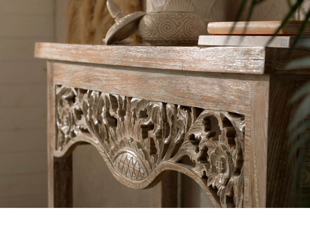 インドネシアの熟練職人が手掛けた天然チークウッドのカービングコンソールテーブル。