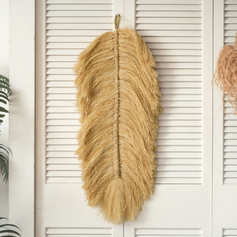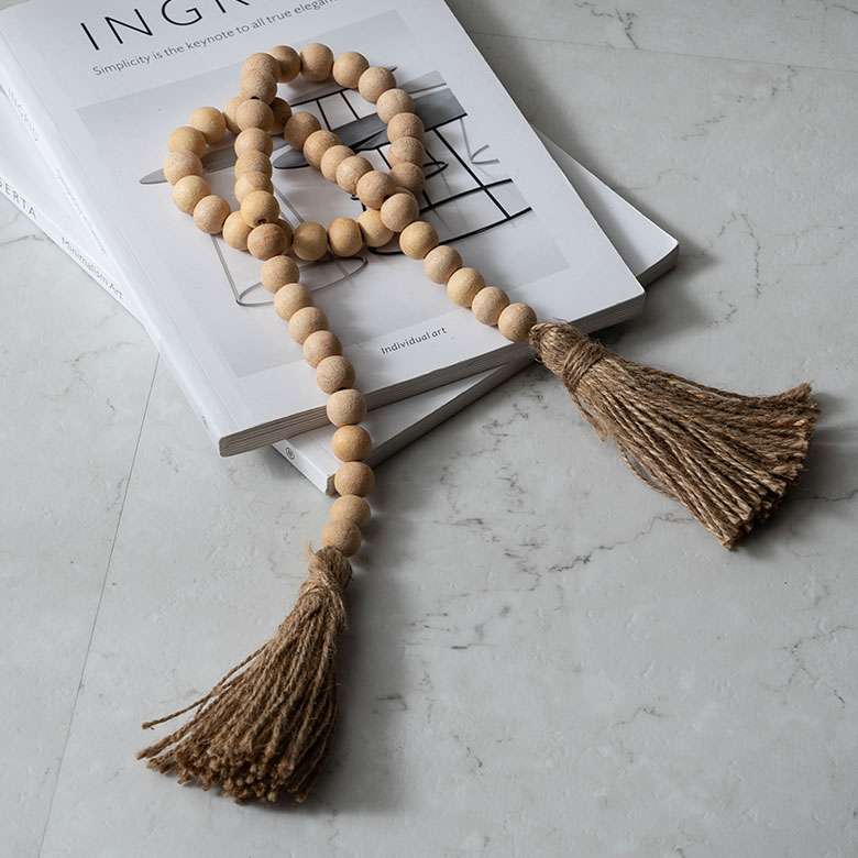 天然木のビーズにジュートのフリンジがアクセントになったガーランド。