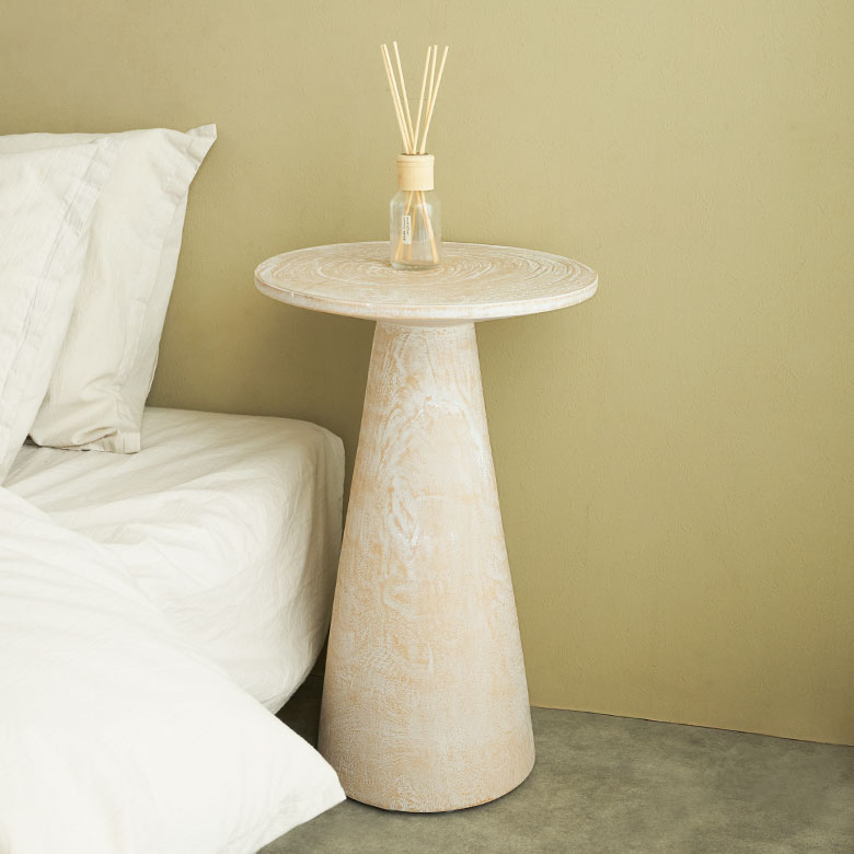 丸い天板と下に向かって広がる円柱型の脚が、柔らかく安定感のあるフォルム。