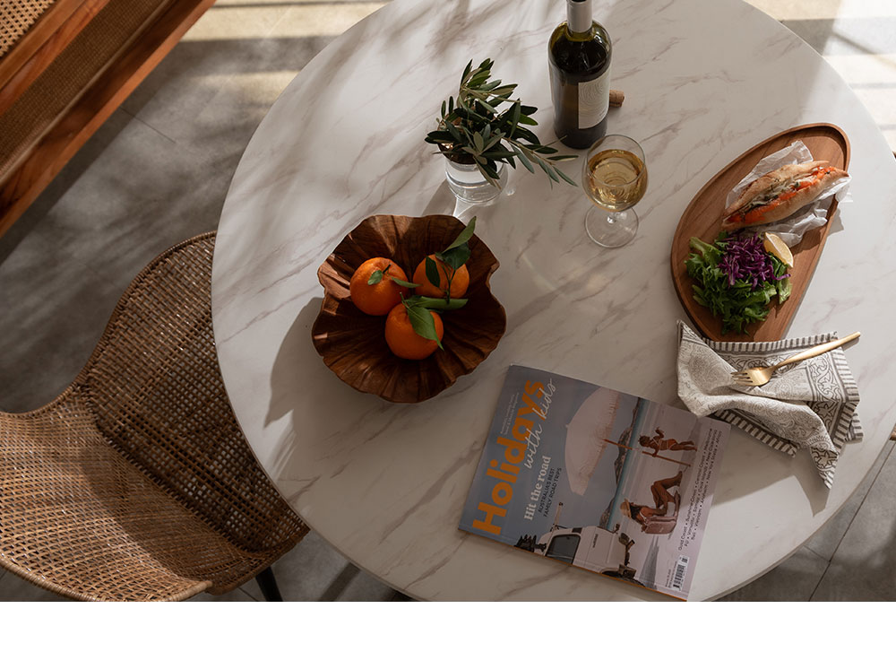 傷や汚れに強い大理石調の天板にラバーウッドのコントラストが美しいテーブル。
